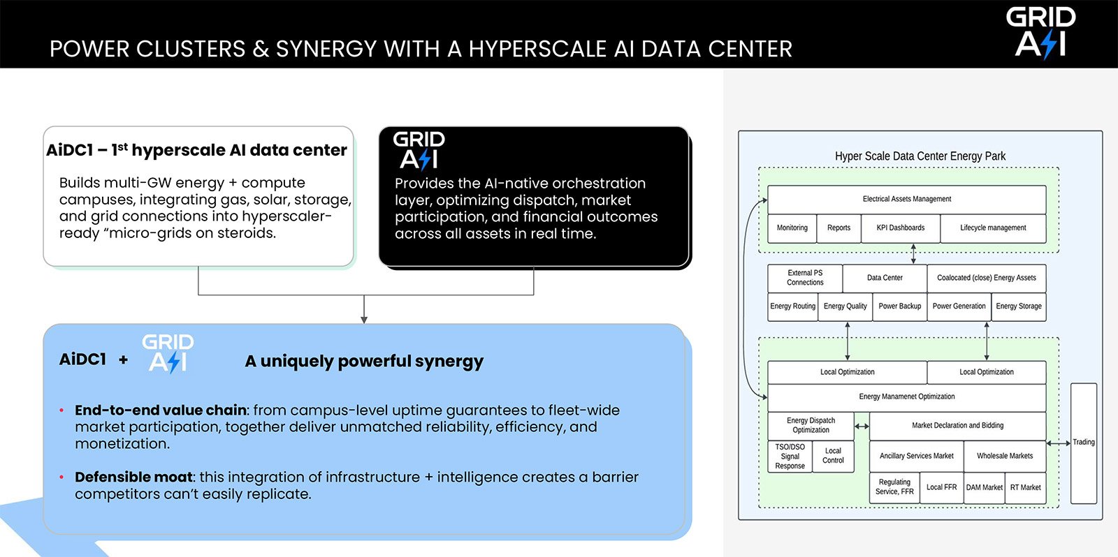 Combination of GRID AI software intelligence with AiDC1 infrastructure creates unmatched orchestration capability at campus and fleet scale.